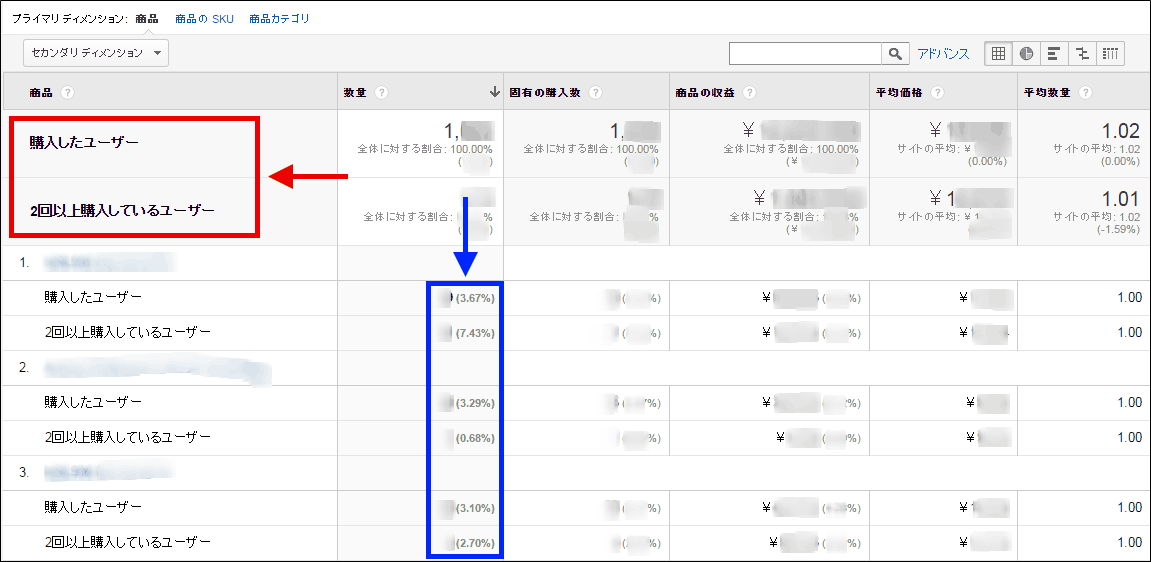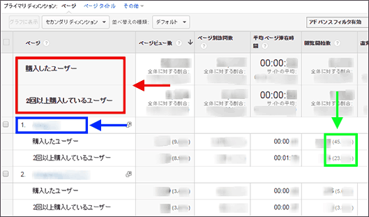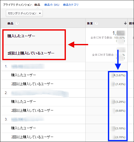 こちらも図ではマスクしていて具体的なものがわかりづらいのが申し訳ないが、「2回以上購入しているユーザー」セグメントで分析するべきポイントは、