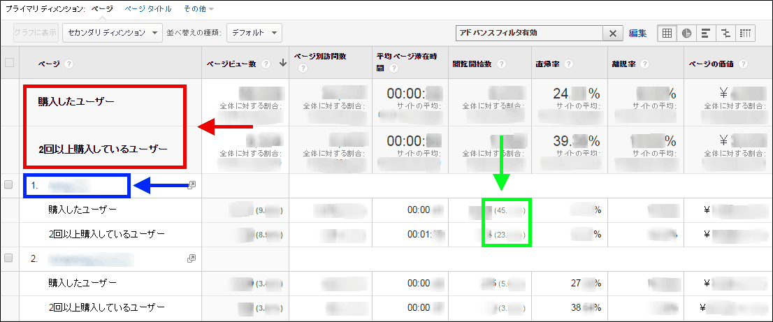 図7でも、扱った購入商品と閲覧コンテンツとの関連性が強く出ると思うが、閲覧コンテンツを確認するため、[行動]>[サイト コンテンツ]>[すべてのページ]レポートに、「購入したユーザー」セグメントと「2回以上購入しているユーザー」セグメントの2つを掛けた(図8赤枠部分)レポートを見ておこう。