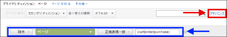 このフィルタでは、「除外」「ページ」「正規表現一致」「(cart|order|purchase)」と指定(図9青枠部分)した。意味としては、URLに「cart」あるいは「order」あるいは「purchase」という文字列を含むページを除いて表示するということだ。