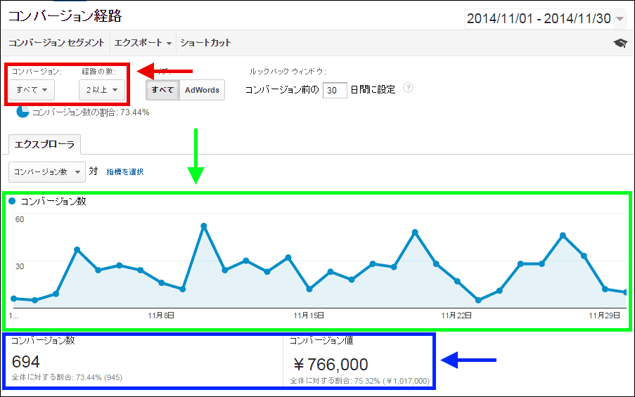 レポート上部には標準で、日別のコンバージョン数グラフ(図2緑枠部分)と、コンバージョン数やコンバージョン値(図2青枠部分)を確認できる。このレポートには、あらかじめ、次のようなフィルタが掛かっている(図2赤枠部分)。