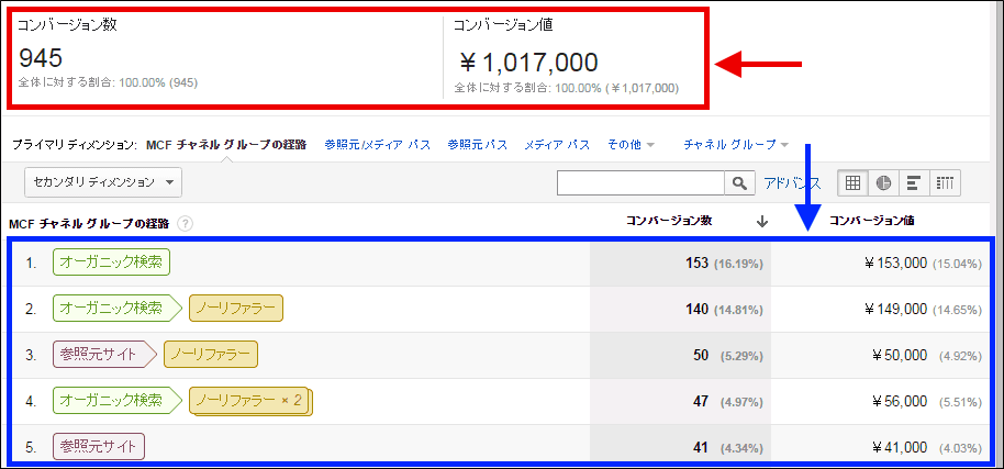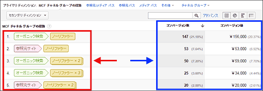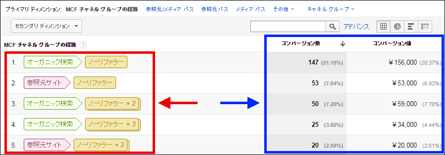 - [コンバージョン]>[マルチチャネル]>[コンバージョン経路]レポートを表示する