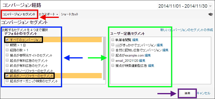 今回は、標準に用意されている「すべてのコンバージョン」と「終点がノーリファラーのセグメント」をチェックして(図6黒枠部分)、「適用」ボタン(図6紫枠部分)をクリックする。