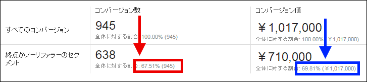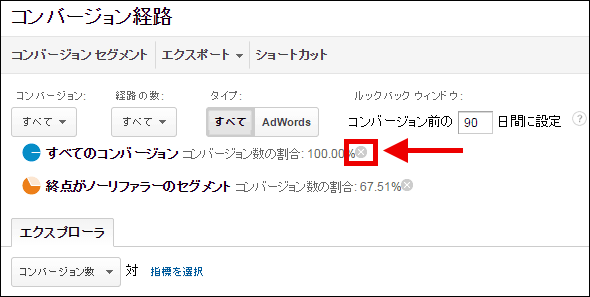 ここで「終点がノーリファラーのセグメント」を掛けたコンバージョン数の全体に対する割合(図7赤枠部分)を見よう。このケースでは、67.51%がこのセグメントを掛けたデータの割合で、非常に高いことがわかる。