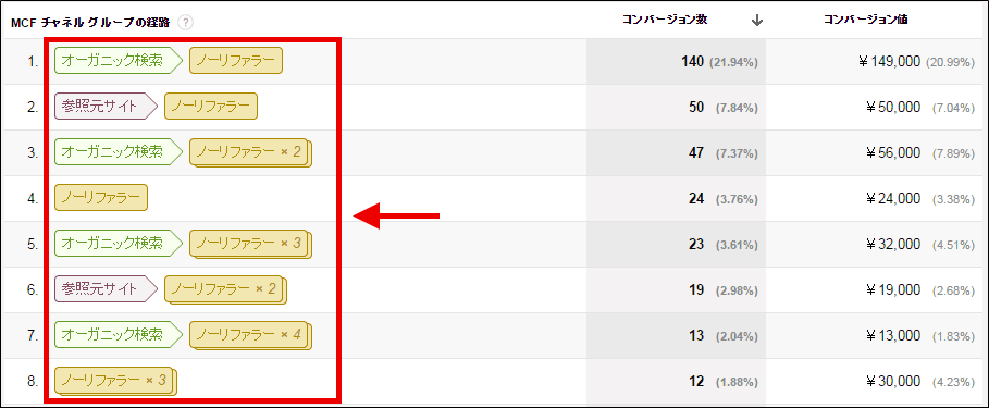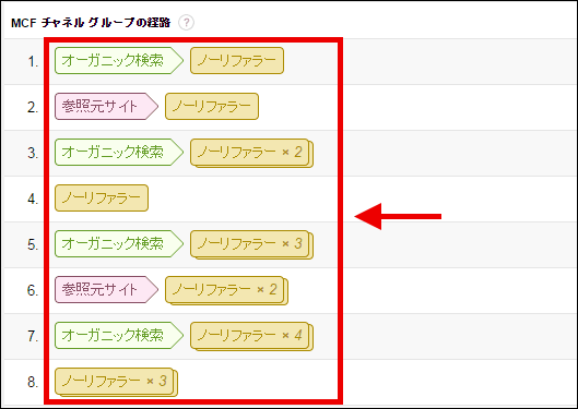 図9赤枠部分が「終点がノーリファラーのセグメント」に絞られた、コンバージョンまでの接触チャネル履歴のパターンだ。