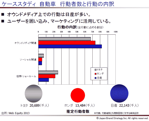 ここで注目されるのは日産だ。通常、ほとんどの指数は販売台数とユーザー数に比例するのだが、オウンドメディア上での行動は、日産がトヨタとホンダよりも多くなっているのだ。