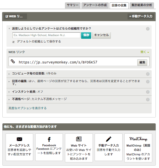 アンケートのリンクを生成できるので、メール(リストに一斉配信可能)、ウェブ(ページに埋め込む、ポップアップさせる)、モバイルアプリ、FacebookやTwitterなどさまざまな方法で配布できる。