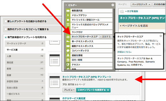 NPSを計測するための質問は、特に米国ではデモグラフィックデータを除けば最もよく使われている質問だ。サーベイモンキーにはNPSのための質問テンプレートが用意されていて、NPS値を自動計算してくれる。