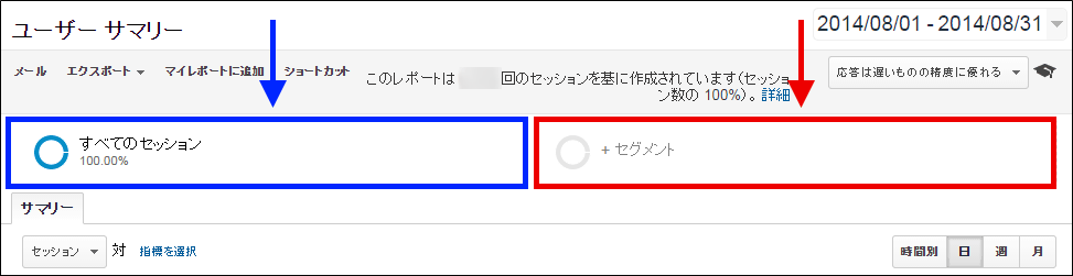 まずレポート画面の上部にある「+セグメント」(図1赤枠部分)のエリアをクリックしよう。ブラウザ表示の横幅が狭い場合は、すべてのセッション(図1青枠部分)の下に並んで表示される。