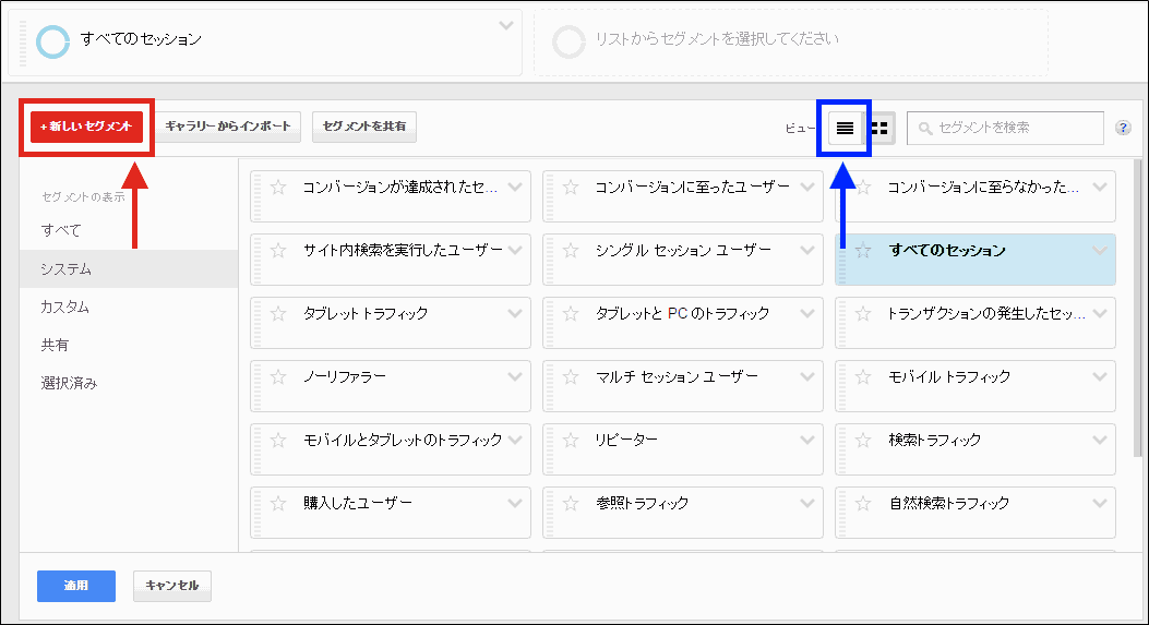 「+セグメント」(図1赤枠部分)のエリアをクリックすると、図2のようなセグメントの機能が表示されるので、左上にある「+新しいセグメント」(図2赤枠部分)をクリックして新規セグメントを作成していこう。