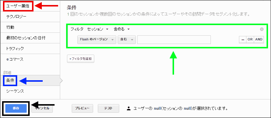 新しいセグメントを作成する初期画面では「ユーザー属性」(図3赤枠部分)が選択されているが、今回作成するセグメントでは「条件」(図3青枠部分)を選択しよう。図3はその「条件」を選択した画面だ。今回設定するセグメントの条件は、図3緑枠部分で行う。