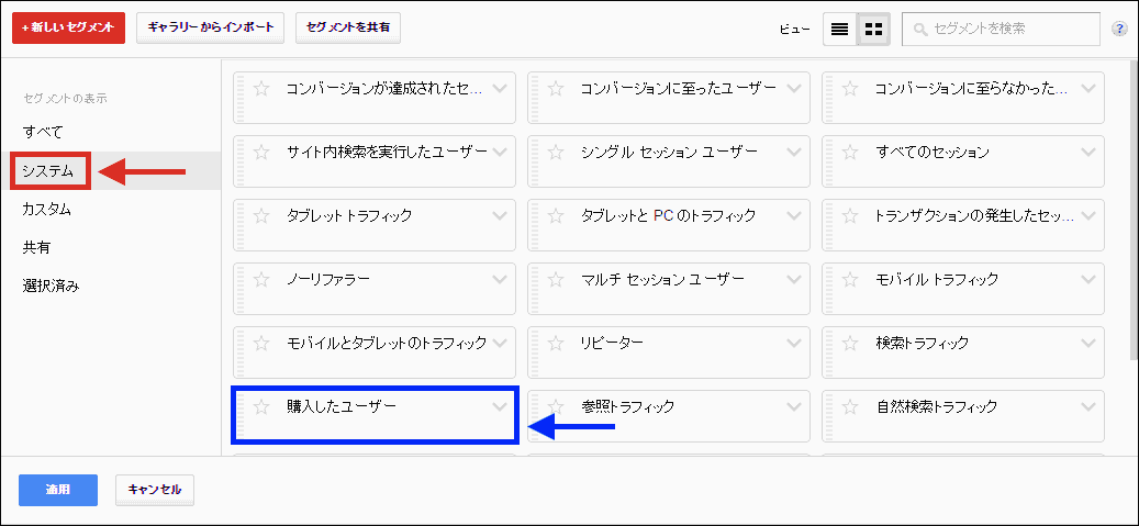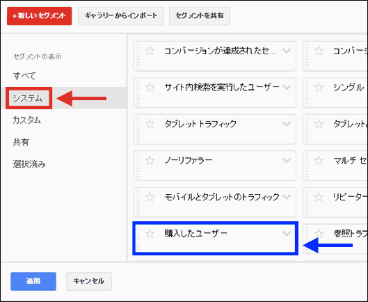 あとは、購入したユーザー全体と比較するのがよいので、そのセグメントも紹介しておこう。こちらは標準で用意されている「購入したユーザー」セグメントを利用すればよい。「システム」分類(図5赤枠部分)をクリックして表示される一覧の中に見つけられるはずだ(図5青枠部分)。