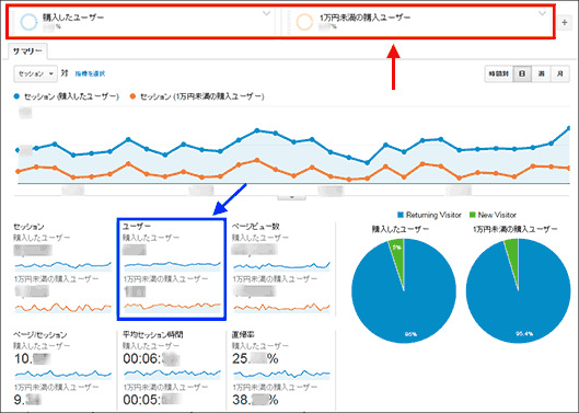 まず[ユーザー]>[サマリー]レポートに「購入したユーザー」と「1万円未満の購入ユーザー」のセグメントを掛けた(図6赤枠部分)レポートを見てみる。