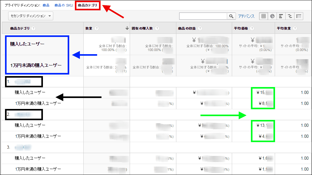 [コンバージョン]>[e コマース]>[商品の販売状況]レポートで、プライマリ ディメンションで「商品カテゴリ」を選択(図9赤枠部分)する。そして「購入したユーザー」と「1万円未満の購入ユーザー」の2つのセグメントを掛けた(図9青枠部分)のが図9だ。