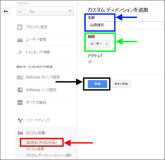 - カスタム ディメンションの「名前」を「会員種別」(図1青枠部分)