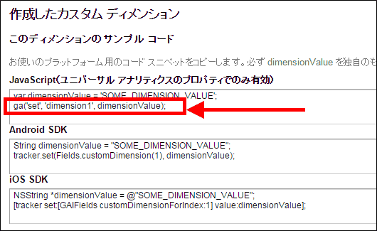 続いて図2のようにこのカスタム ディメンションに対応したトラッキングコードが表示されるので、普通のWebサイトの計測であれば、一番上の「JavaScript(ユニバーサル アナリティクスのプロパティでのみ有効)」の欄に表示されているスクリプト(図2赤枠部分)を利用する。