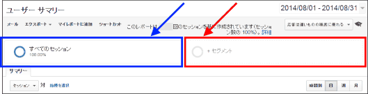 まずレポート画面の上部にある「+セグメント」(図3赤枠部分)のエリアをクリックしよう。ブラウザ表示の横幅が狭い場合は、すべてのセッション(図3青枠部分)の下に並んで表示される。