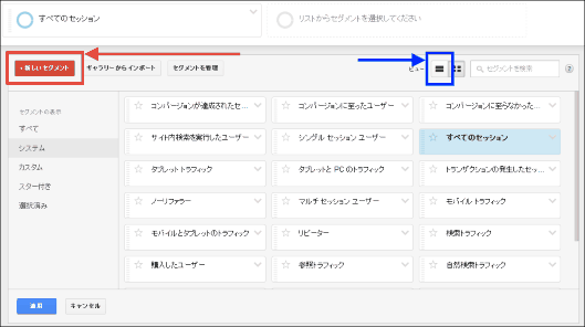 「+セグメント」(図3赤枠部分)のエリアをクリックすると、図4のようなセグメントの機能が表示されるので、左上にある「+新しいセグメント」(図4赤枠部分)をクリックして新規セグメントを作成していこう。
