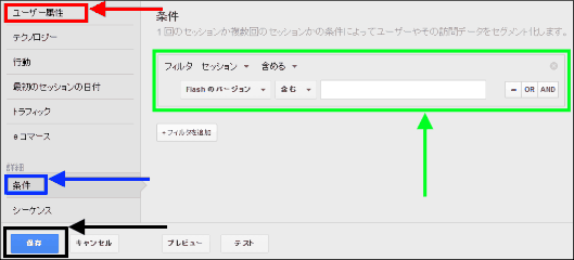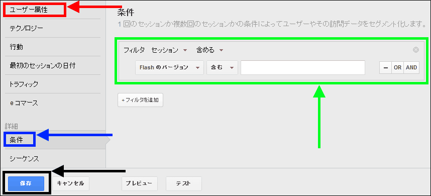 図5はその「条件」を選択した画面だ。今回のセグメントの条件設定は、図5緑枠部分で行う。