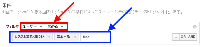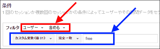 その下の項目は、「カスタム変数(値01)」「完全一致」「free」(図6青枠部分)のように設定する。カスタム変数の1つ目に付与した値が「free」に一致するユーザーに絞り込むということだ。このような設定をして、「保存」(図5黒枠部分)しよう。