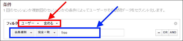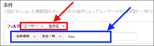 その下の項目は、「会員種別」「完全一致」「free」(図7青枠部分)のように設定する。意味としては「会員種別」(図1青枠部分)という名前の「カスタム ディメンション」の値が「free」のユーザーに絞り込むということになる。このような設定をして、「保存」(図5黒枠部分)しよう。