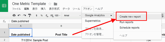 次に、新しいレポートを作成する。[アドオン]>[Google Analytics]で選択できる。