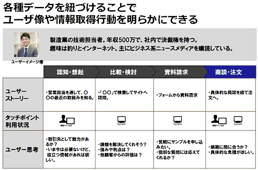 そのため、リアルも含めどのような行動を経て購買にたどり着いたのかという「ユーザーストーリー」や、営業からセールスを受けたといったリアルでの「タッチポイント」、どの時点でテンションが高まったのかといった「ユーザーの思考」はWebの情報だけではわからない。