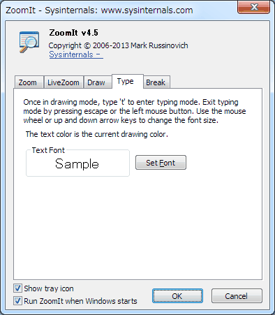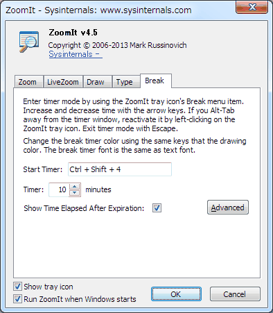 まず、設定画面の下にある「Show tray icon(トレイアイコンを表示)」と「Run ZoomIt when Windows starts(Windows起動時にZoomItを実行)」をオンにしておきましょう。