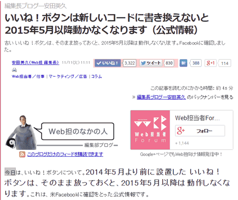 FacebookのJavascript SDKに新バージョンが導入されるため、2015年4月30日に旧バージョンのサポートが終了します。これにともない、「いいね!」ボタンなど、ソーシャルプラグインのコード変更が必要です。