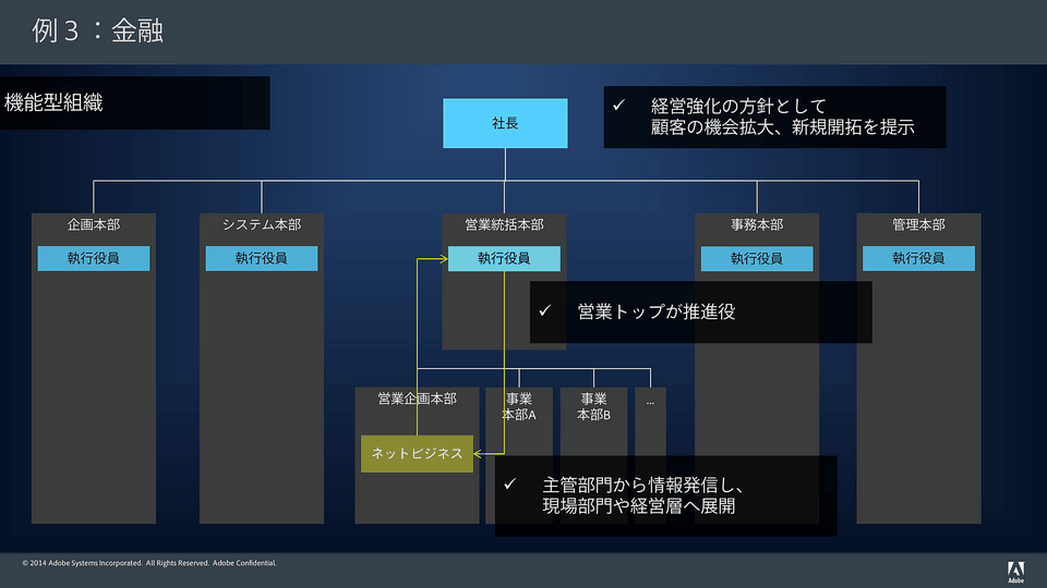 そのため、現場の課題を把握しつつ、経営方針を実行に導くための調整役として、執行役員クラスが組織内で指揮を振るう。