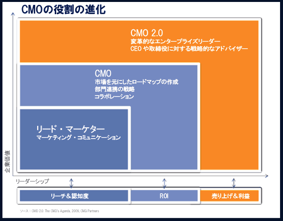 米国のコンサルティング会社であるCGM Partnersは、CMOの役割を、次の3段階で引き上げていくことを提唱している(2009年)。