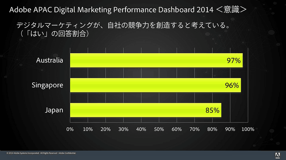 これは、アドビシステムズとCMOカウンシルによるデジタルマーケティングの取り組み実態に関する意識調査結果である。下記のようにいずれも、日本の数値が低い結果である。