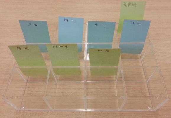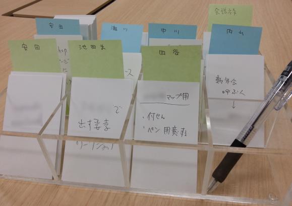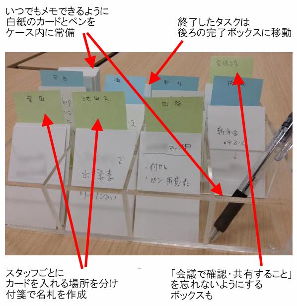 「これやっといて」と頼んだ仕事は、自分でカードを書いて、その人の名札のあるボックスに入れておきます。