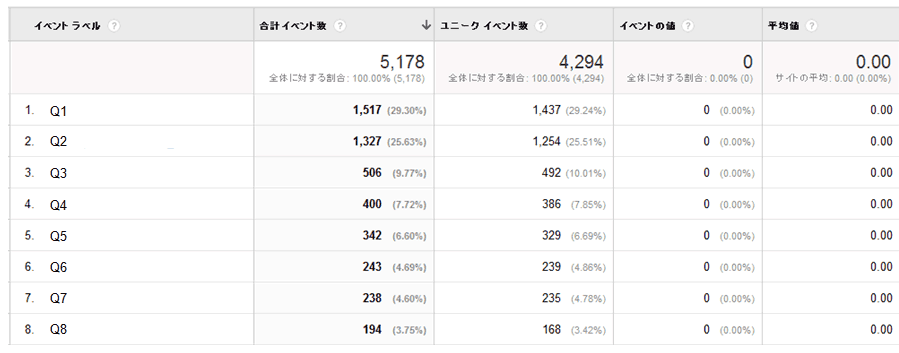 このように記述することで、Google アナリティクスが、このリンクのクリック回数を「イベント」として計測できるようになります。レポートではQA_Clickが何回発生した、Q1が何回クリックされたかを調べることができます。