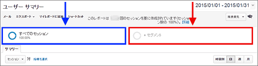 まずレポート画面の上部にある「+セグメント」(図1赤枠部分)のエリアをクリックしよう。ブラウザ表示の横幅が狭い場合は、すべてのセッション(図1青枠部分)の下に並んで表示される。