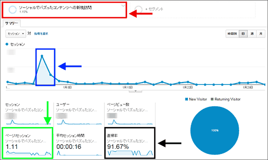 この例では、確かに1月上旬に該当ページが閲覧開始ページになった新規訪問のアクセスが急増している(図5青枠部分)のが確認できる。それ以外の時期にはほとんどセッション(訪問)がなく、話題は一時的に盛り上がっただけで持続性がなかったこともわかった。