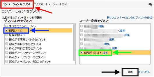 そしてこの2つのセグメントをレポートに掛ける場合は、コンバージョン セグメント機能(図5赤枠部分)をクリックし、デフォルトのセグメントの中にある「期間 > 1日」(図5青枠部分)と、ユーザー定義セグメントの中にある、先ほど作成した「期間が1日以下」(図5緑枠部分)にチェックをして、[適用]ボタン(図5黒枠部分)をクリックすればよい。