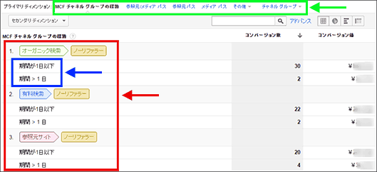 図10は標準に用意されている「MCF チャネル グループ」というディメンションでレポート表示しているが、「参照元/メディア」のディメンションで表示したり、任意の自分の好きな分類で表示させたりすることもできるので、違うディメンションを選択(図10緑枠部分)してみてもよいだろう。