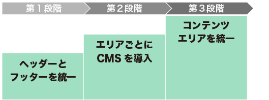 第2段階は、サイズをそろえる! ということで、67か国をヨーロッパ、アジアパシフィック、米州(南北アメリカ)、中国とエリアに区切って、その地域の統括現地法人が域内のカントリーサイトをまとめることにしました。また、「67か国すべてのサイトを1つのCMSにまとめて本社直轄にするのは無理」と考え、それぞれ使用するCMSも現地で使い慣れたCMSを使うことにして、一本化はしませんでした。