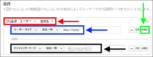 - 「ユーザー タイプ」「完全一致」「New Visitor」