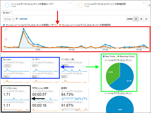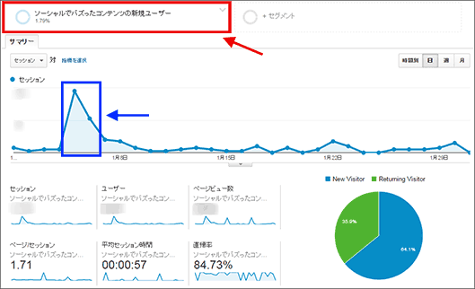 この例では、確かに1月上旬に該当ページが閲覧開始ページになった新規訪問のアクセスが急増している(図5青枠部分)のが確認できる。これが今回ソーシャルからバズったコンテンツ閲覧だったのだが、それ以外の時期にはあまりセッション(訪問)がないように見える。つまり、バズったコンテンツをきっかけにサイトに来訪したユーザーは、その後ほとんどサイトには訪問して来てくれていないということだ。