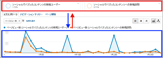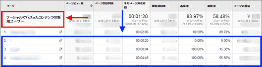 「ソーシャルでバズったコンテンツの新規ユーザー」セグメントでは回遊度が上がって平均1.71(図6黒枠部分の上)だった。バズった初回訪問での回遊は1.11(図6黒枠部分の下)だったので、2回目以降の訪問では複数ページを閲覧していることが多いということがわかる。