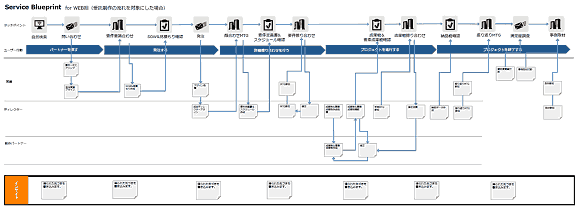 サービスブループリントは、顧客へのサービス提供プロセスのすべてのタッチポイントとサービス提供側のバックステージのプロセスを視覚化するためのツールです。