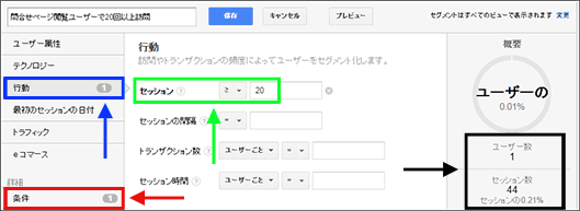 「条件」分類の画面(図9赤枠部分)で図5と同じ条件を指定したうえで、さらに「行動」分類の画面(図9青枠部分)で、「セッション」「以上」「20」と指定する(図9緑枠部分)。この結果はすぐに設定画面右側(図9黒枠部分)で確認できる。