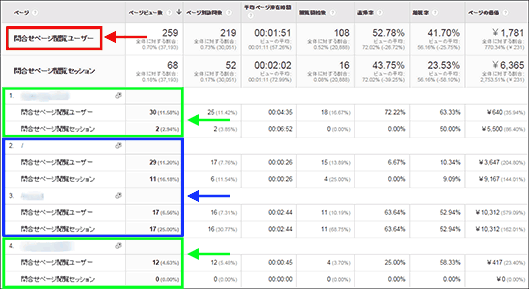 問い合わせページを閲覧した人(及び訪問)は3か月間に16件(図7青枠部分)と少ない。ただし、その人たちのすべてのセッション数(問い合わせページを閲覧しなかったセッションも含めたもの)は108(図7緑枠部分)と、1人平均にすると7回弱(108÷16)リピートしている計算になるので、関心が十分ある人たちであることが考えられる。