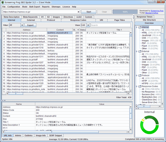 取り組んでいるウェブサイトの必要情報をScreaming Frogで収集しよう。ボックスにURLを入力して「Start」をクリックすると、ウェブサイトからすべてのデータを取得してきてくれる(残念ながら無料版では500 URL分しかクロールできないが)。