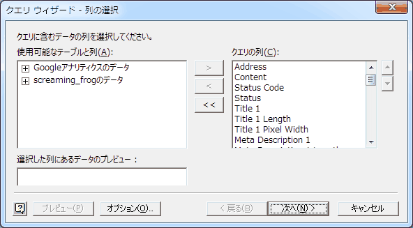 するとMicrosoft Queryのウィンドウが表示されるので、表の上部にあるボックスで、Googleアナリティクスデータの「ページ」をScreaming Frogデータの「Address」にドラッグする。次のようになるはずだ。