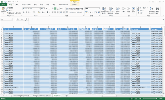 1つのシートにScreaming FrogとGoogleアナリティクスのデータを組み合わせたデータができているはずだ。あとはこれを好きなようにに活用しよう。