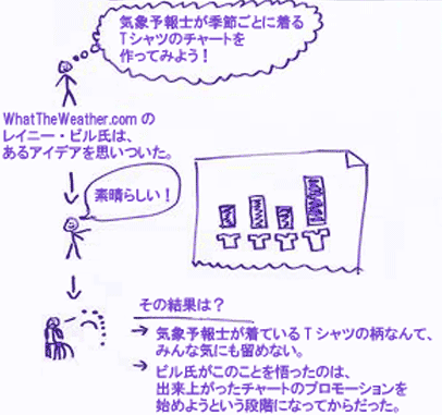 良い案だと考えたビル氏は、これを作成する。気象予報士が季節の変化に合わせて着ている、さまざまなTシャツが表示されたすばらしいチャートを作って、大満足だ。
