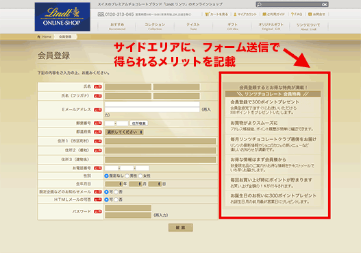 フォーム送信後に得られるメリット※をサイドエリアに入れています。結果として、入力ページの上下の高さを節約することに成功しており、ファーストビューで表示できる内容を増やし、より入力へのモチベーションを高めることができていると思います。