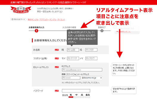 項目ごとのリアルタイムアラート表示はもちろん、項目ごとの入力における注意点を黒い吹き出しで表示しています。この吹き出しは入力内容に連動していて入力支援機能として動作しています。